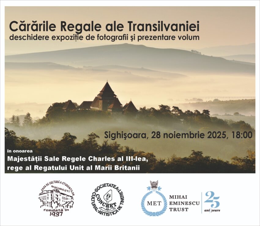 Casa de Cultură a Studenților din București, în parteneriat cu Societatea Cultural Artistică de Tineret ”Concret” din București și Fundația “Mihai Eminescu Trust” din Sighișoara, organizează vineri, 28 noiembrie 2025, ora 18:00, în cadrul Centrului de Artă Medievală MEDIEVALIS, Piața Cetății nr. 8, etaj 2, din Sighișoara, expoziția de fotografie CĂRĂRILE REGALE ALE TRANSILVANIEI.
